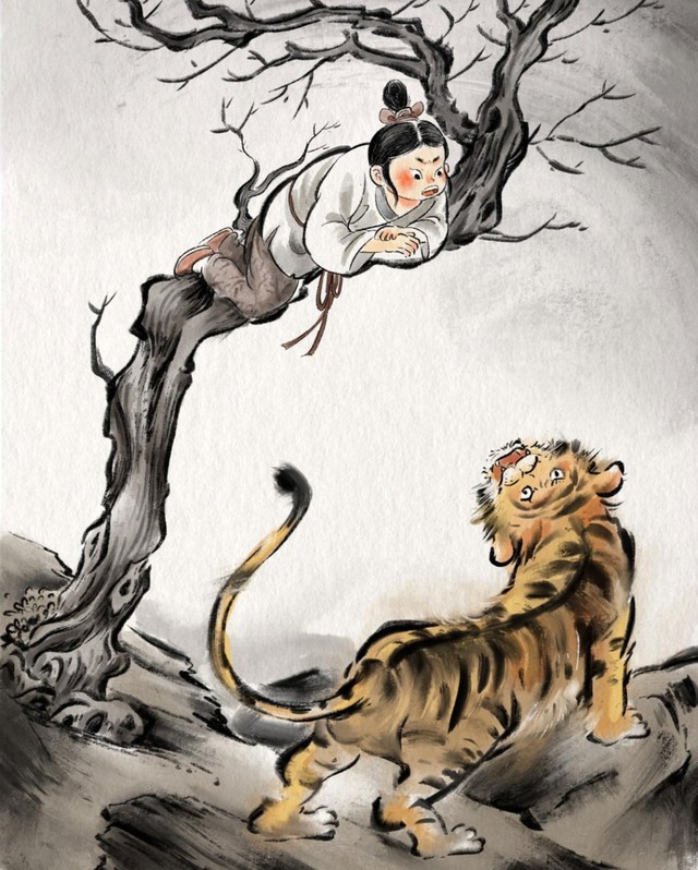 你尿完了没有?”老虎妈妈在屋子里大喊,没有听到姐姐的回答。它牵动带子,却只听到了门的响声。老虎就跑出来了。它在树下看到了姐姐。“下来!”老虎说。