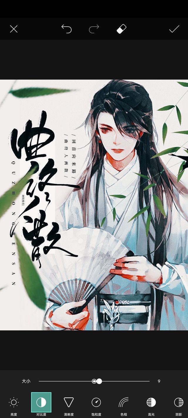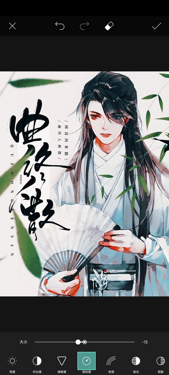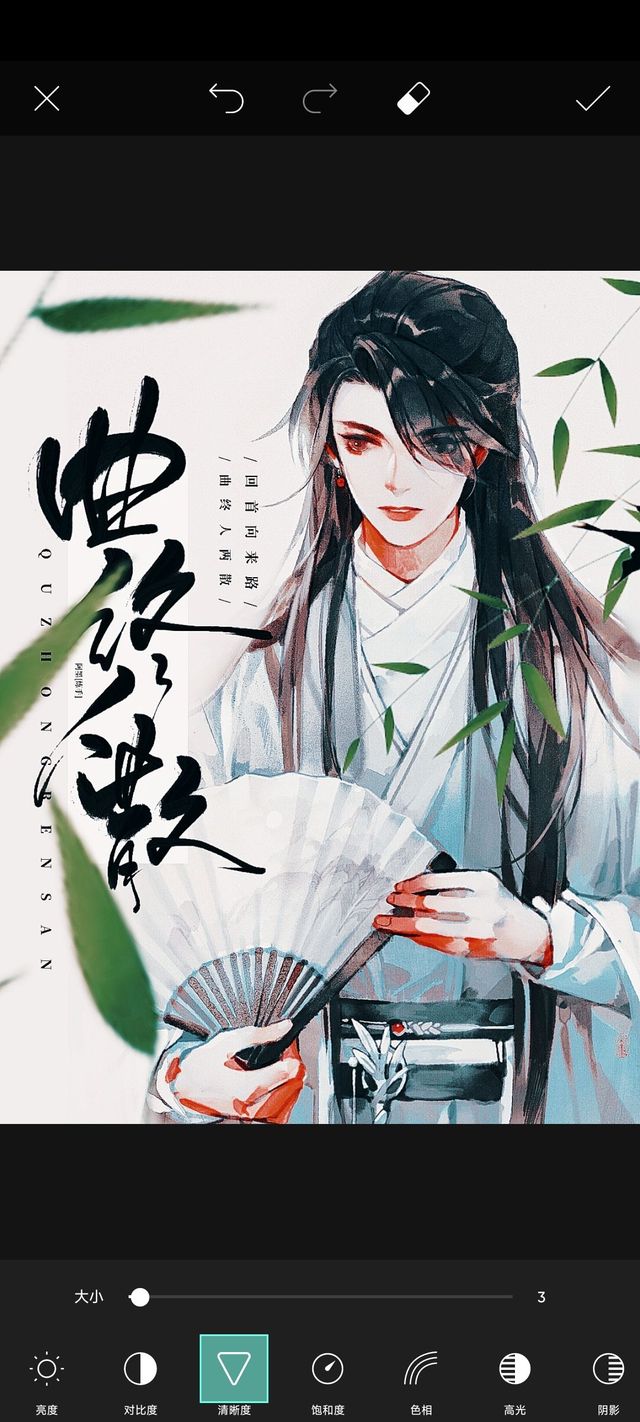 阿墨:加入两个竹叶素材,放大旋转移动到合适的位置,点击右上角的✓