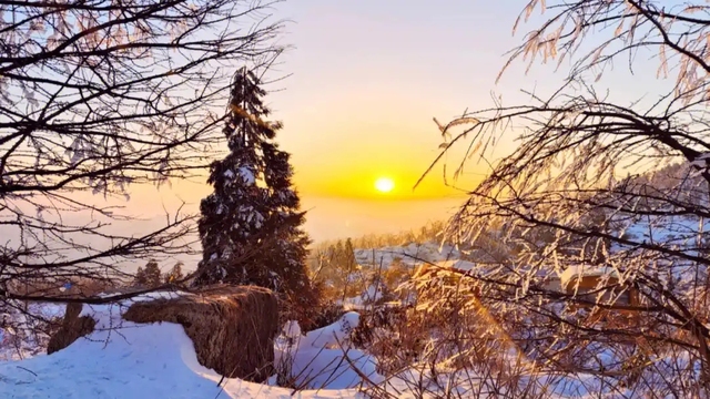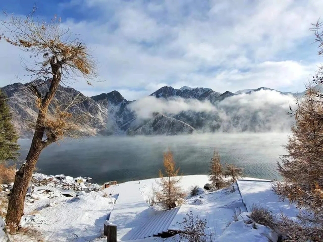天池的附近都是大山,而且山上有常年不化的白雪,还有一些茂密的林子。清晨时太阳东升,阳光洒在雪山山顶,雾气笼罩,犹如金色的圣光落了下来,美不胜收。