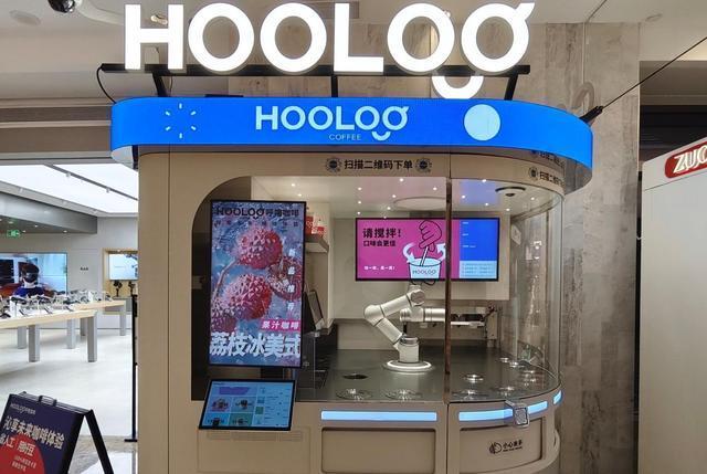 师姐刘灵子首席运营官:机器人化身咖啡师,智能机械臂自动化操作,在一个透明玻璃柜中,上方是品类丰富的电子菜单,下方是科技感十足的咖啡机器人,