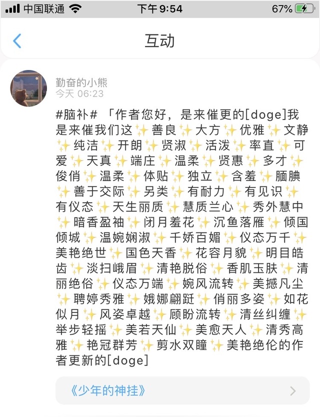 龙蝶女神:“抱歉啊兄弟,最近这段时间少年派2不是出来了吗,我刚得知消息激动的呀,连着看了好几遍,把稿子一直拖到现在,对不起对不起”😖