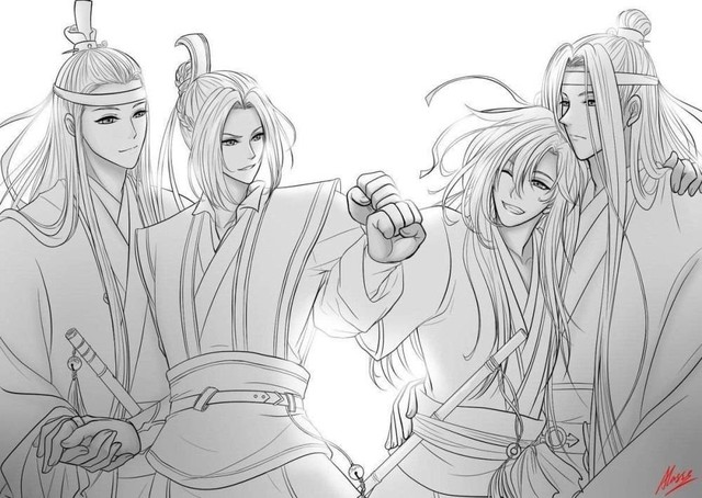 云梦双杰回来了,姑苏双壁也站在了云梦双杰旁,江澄一手放在蓝曦臣手里,一手和魏无羡打拳,蓝忘机和魏无羡抱着的,四人都笑的很甜