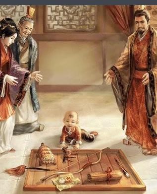 作者:周岁礼:南北朝时出现,自此一直盛行不衰的“周岁晬盘”(亦称“抓周”)礼俗,在清朝宫廷和民间,依然盛行。所谓“抓周”,就是婴儿一周岁时,父母家人在盘中放各种物品,让他/她随意去抓;以其所抓之物,预测其未来的志趣、成就。清宫皇子一周岁时,“用玉陈设二事、玉扇坠二枚、金匙一件、银盒一盒、犀钟一棒、犀棒一双、弧一张、矢一拔、文房一份、晬盘一具、果筵一席。……惟公主、皇孙女不设弧矢。”与宫廷中稍有不同的是,民间“抓周”,多用金银、文房四宝、书籍、秤尺刀剪、女工针线、玩具等。(百度文献)