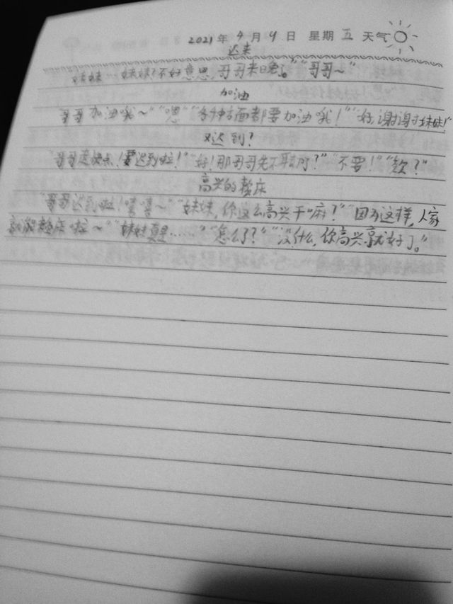 4,9 今天考试,哥哥听到一个同学说不出操,去考试还以为是玩笑,结果考试又迟到挨骂了......不过之后睡到倒垃圾去吃了饭,再睡到放学,回家了,撑着遮阳伞回家很开心!可惜妹妹看不见,哥哥会很期待你的怀抱的,妹妹!