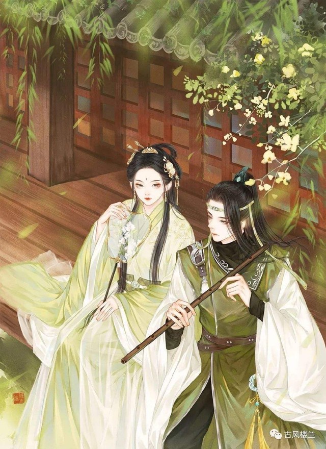 梨花树下的二人正一个人赏着花听着笛子,一个人正吹着笛子。