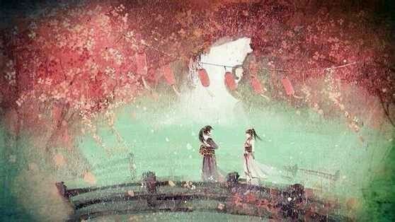 青竹寺外,风吹叶摇,掀起故梦,清晨的阳光透过树叶照射着青石路,留下斑驳的光影,一对童子,踏着光与影牵手嬉戏,风扬起了女童的裙角,两个小小的身体后面,拖着长长的影子,仿佛看到了他们长大以后的样子。