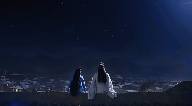 两个人并肩坐着,一同看着天上的明月