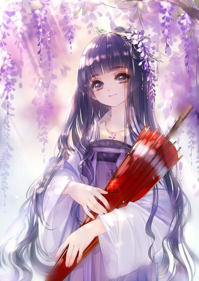 她身穿一袭紫色古装,纤细的双手拥抱着一把红色的油纸伞,飘逸的紫色长发未扎,随意披散着,头戴紫藤花
