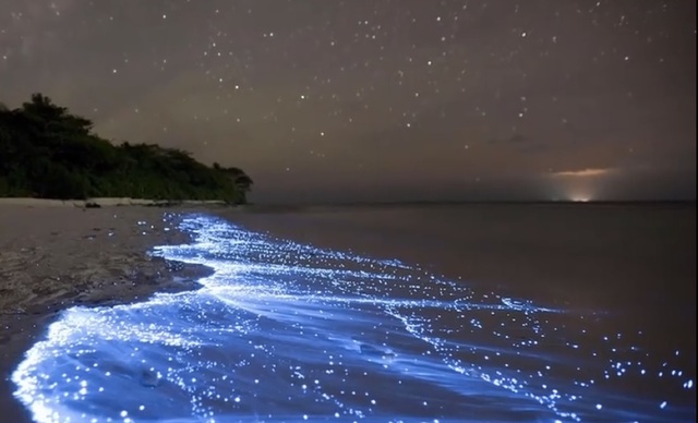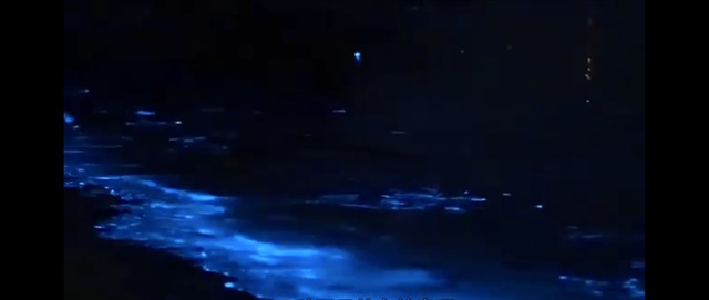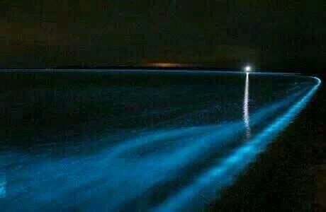 路灯下两人的影子互相依偎,两人也挨得极近,手拉着手站在海边看着风景,风轻轻拂过海面泛起蓝色荧光,像蓝色星河,星星点点,美丽而神秘。