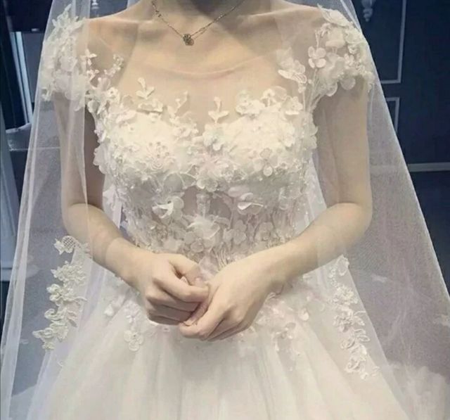方一芸纯白得无丝无痕.点缀的蕾丝花边,雪纺纱裙的优雅,完美搭配。婚纱,像花瓣百合花一样淡泊、娇柔,轻薄透明的面料,以及绣花,一切都是那样完美动人。那件层层叠叠轻纱弥漫,缀满软缎织就的玫瑰和宝石拼镶的婚纱,是对爱情的期盼,是对幸福的憧憬