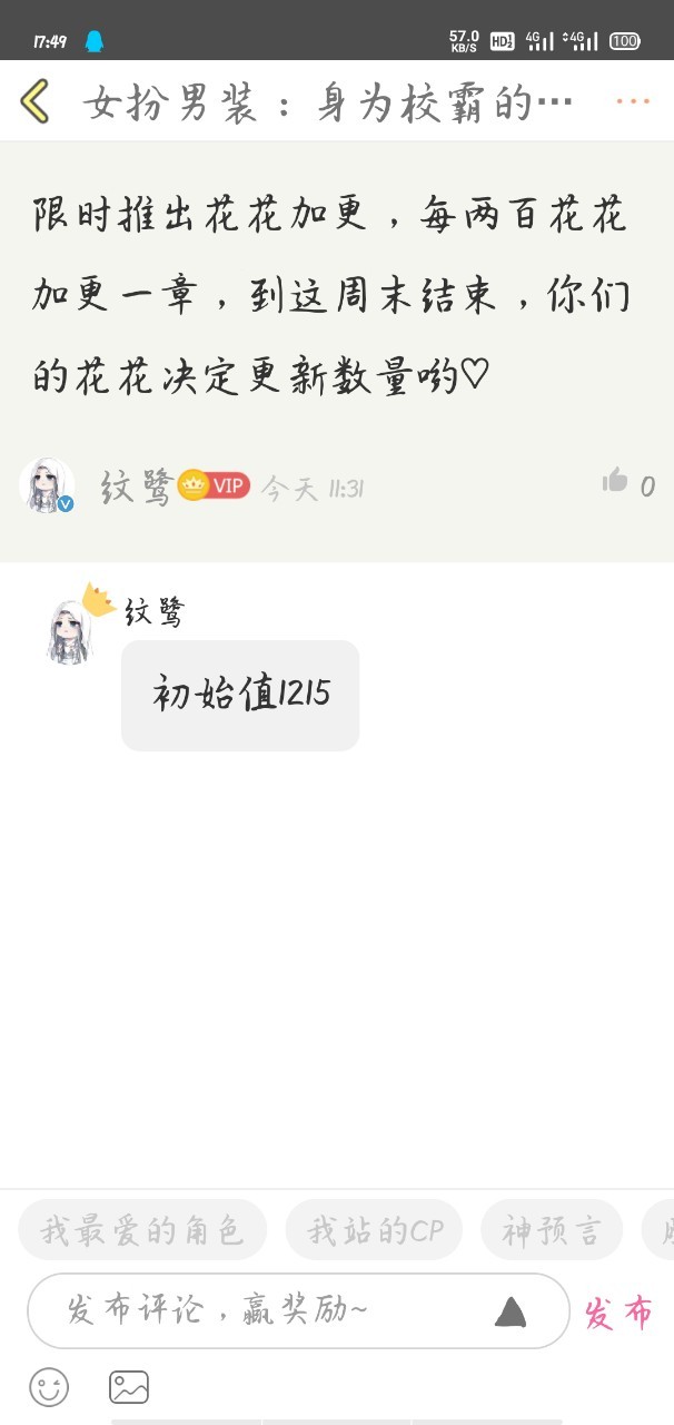 纹路路:咳咳,宣布两件事情,第一,这周粉丝福利,累积两百花花加更一章