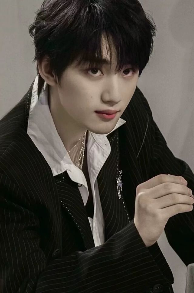一个不爱穿西服的张真源也穿上了一套黑色西服里面搭着也是白色的穿着黑色的皮鞋头发也很好看脖子上什么也没有带手上戴着一个手环上面写着鑫字