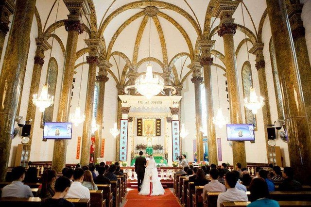 一位神父站在新人之间,亲友们庄严肃穆的坐在那里。
