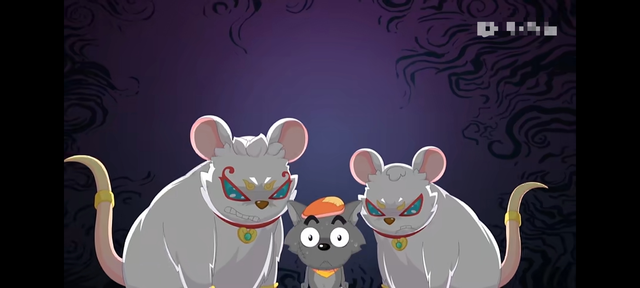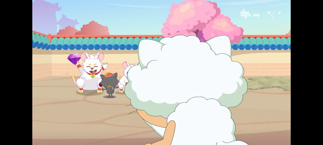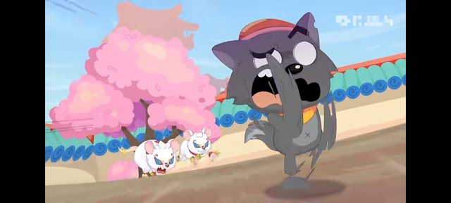 慢猫猫注意到了跟两只奇兽玩得正欢的灰太狼。