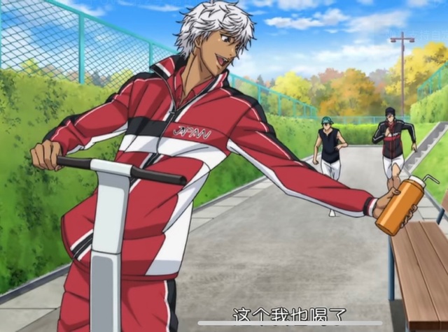 种子岛骑着代步车飞驰而过,抢走了真田玄一郎放在椅子上的水。
