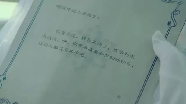 苏眠(白锦曦):“暗夜中的小丑先生,你曾死过,现在又活了,直活到永永远远,你拿着虚妄和梦幻的钥匙,让世人都沉溺其中吧——K”
