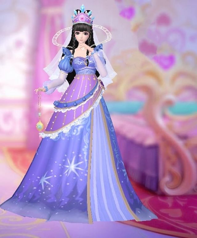 王默时间之神时间公主:只见对面,气质高贵,超尘脱俗,拥有银黑色的长发与星河般的眼睛。头戴宝石头冠,发披透明轻纱,额头珍珠作为点缀,鼻子右边有一颗蓝色的钻石鼻钉。服装是深紫色的欧美风伞裙,脚踏紫色水晶高跟鞋。整体显得神秘而优雅
