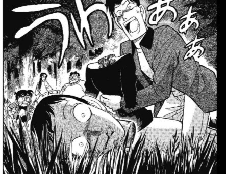 柯南突然停下脚步,手电筒光柱打向的位置绿色草地上的是一条断腿,鲜血染红周围的草地