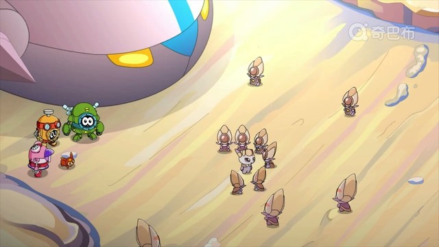 突然,一艘飞船降落在了路中央,从飞船里走出了三个机器人和两只精灵