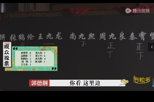 郭德纲:你看,这里面,分数最高的应该是秦霄贤。可见干咱们这行跟艺术没有关系。观众们,小姑娘们多。但小姑娘们多,王九龙不应该就一票啊。是吃了烧饼的瓜落儿吗。