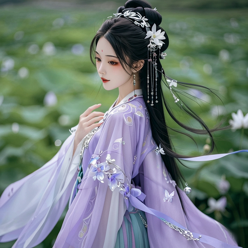 发髻很简单,还有一部分头发散落着,头上银饰倒是不少,身着的是一身紫衣,飘飘然若神仙之楷