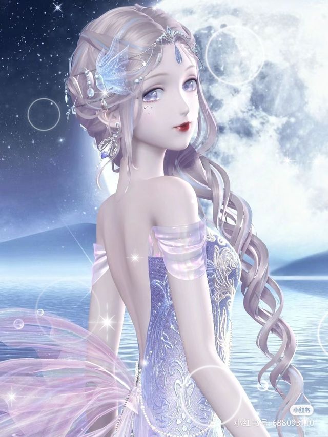 就这样,沫月换上了那件纯净如雪的水晶公主裙,她的发丝亦随之由深邃的黑转为银白,宛如月之女神自天际缓缓降临。她那双眼睛,湛蓝中透着一抹紫罗兰色的光泽,美得令人屏息。