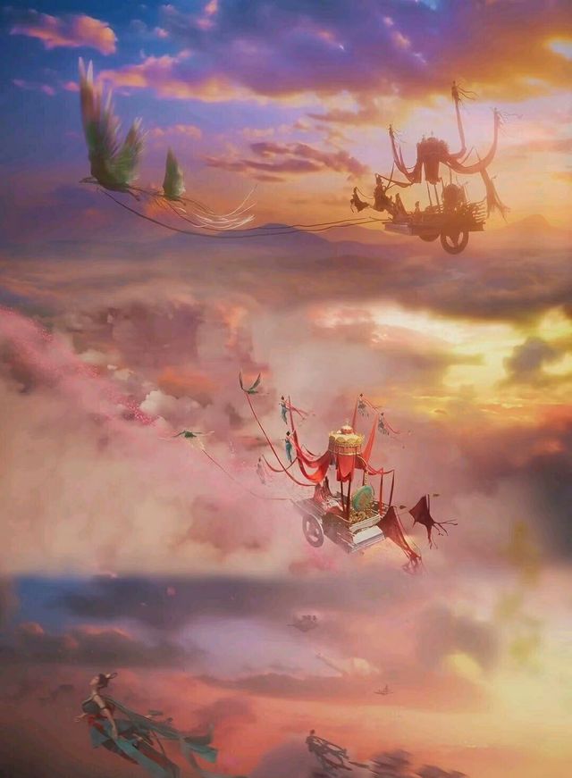 迎亲车队从墨河飞起,循着天柱一路向上,天空彩霞缠绕,仙乐飘飘。