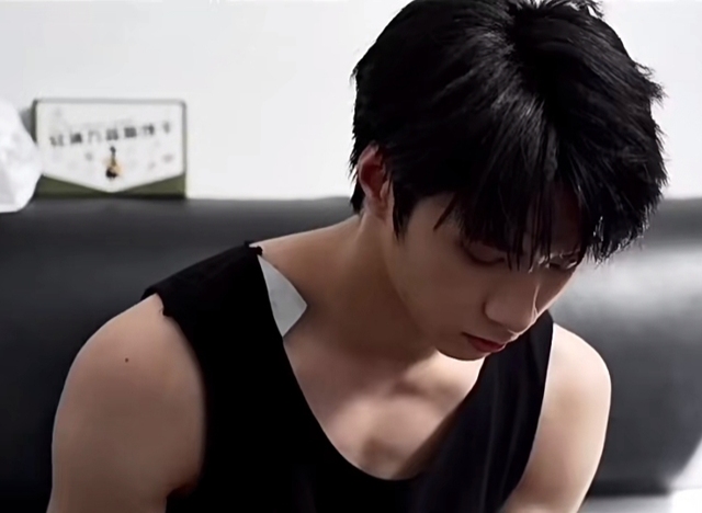 刘耀文刚跑完步,带着的蓝牙耳机还播放着音乐,坐在场边的椅子上喘着气,汗水顺着他的鬓角滑下,浸湿额前碎发。