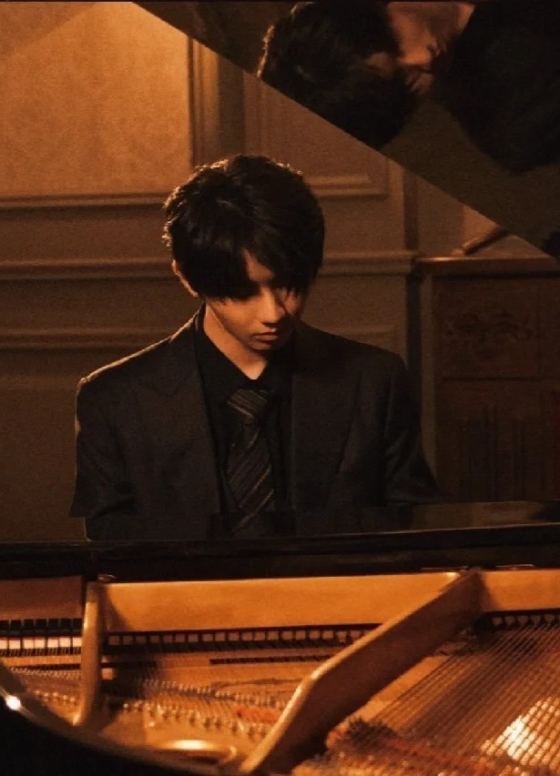 宏伟的音乐厅内,灯光柔和地聚焦在舞台中央的三角钢琴上,马嘉祺身着经典黑色礼服,身姿挺拔清隽。