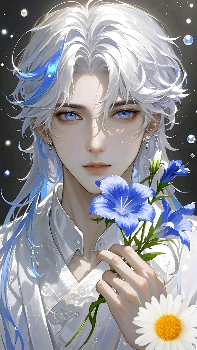 他的蓝色长发在水中飞舞,如同灵动的蓝色丝绦,随着他的动作摇曳生姿。