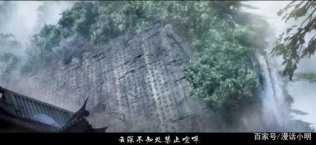 魏无羡转身望过去只见一面悬崖上满满的写着蓝氏家规,极其壮观。