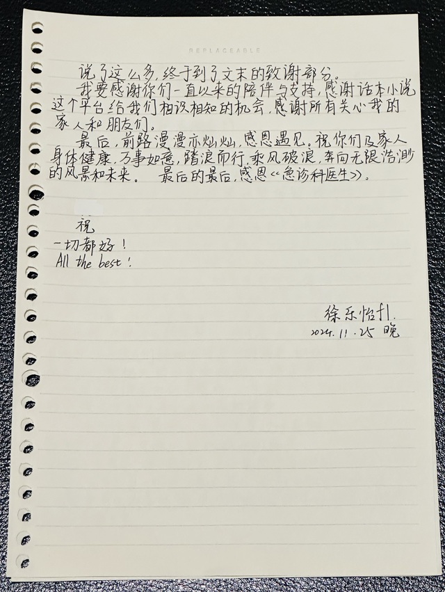 刚开始写这本小说时,是因为看了大多遍《急诊科医生》,觉得它的结局有些意难平,又恰巧十分喜欢三位老师,急诊科逐渐成为我生活中不可或缺的一部分。正如我最开始的签名“一个默默无闻的小作者”。但是是你们让我感受到写作的乐趣与魅力,让我感受到被认可和被喜欢的美好与幸福。