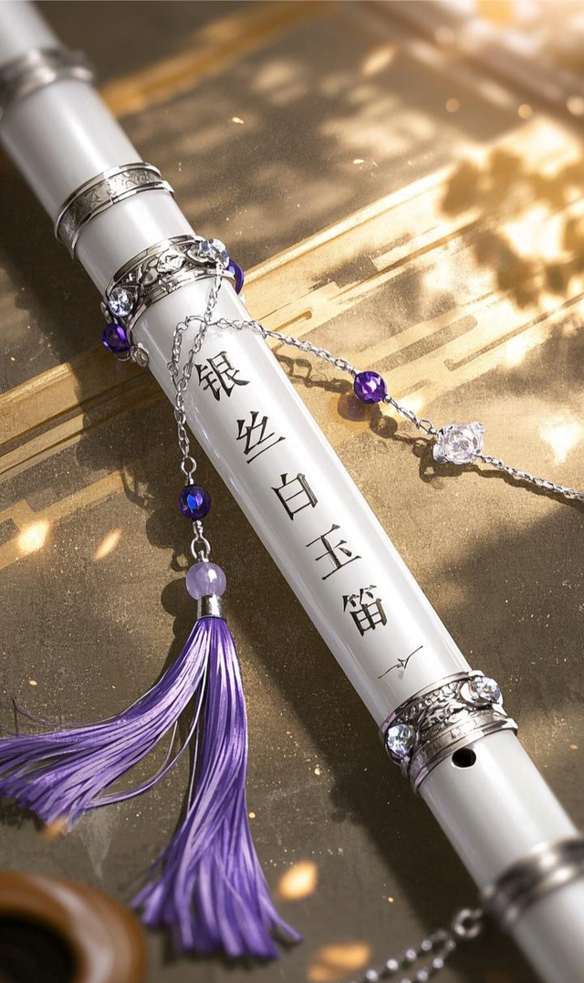 话音刚落他没有丝毫犹豫,就答应了她的请求。手指滑动的瞬间一只通体为羊脂白玉的笛子赫然出现在了他的手中,在它的表面上有着些许银丝纹路,在它的尾端吊着一颗紫色和一颗银色的水晶流苏。在那上面用银色刻着“银丝白玉笛”五个字。