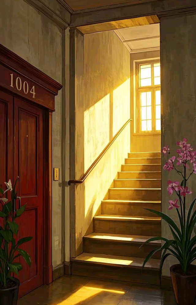 随着那缕光芒丝线轻盈地停在一单元第7层,它并未就此止步,而是继续向前,在楼道间蜿蜒穿梭,宛如夜空中指引方向的星芒。最终,这丝线在一间红褐色木质房门前悄然驻足。房门之外,两盆兰花静静伫立,似是在守护着这片小小的空间;木制门楣上,“1004”这个房间号清晰可见。